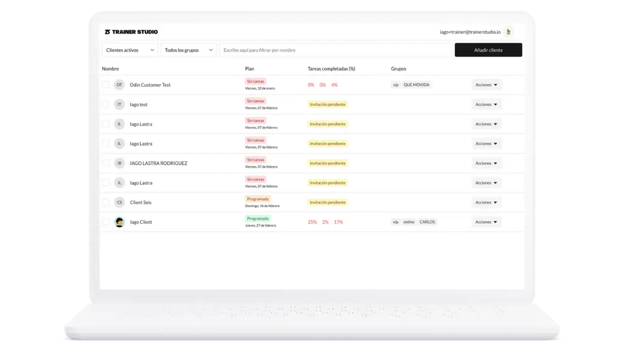 Escala tu negocio con confianza. Añade entrenadores a tu equipo, asigna clientes y controla permisos. Perfecto si tienes un gimnasio o centro de entrenamiento y quieres crecer sin perder el control.